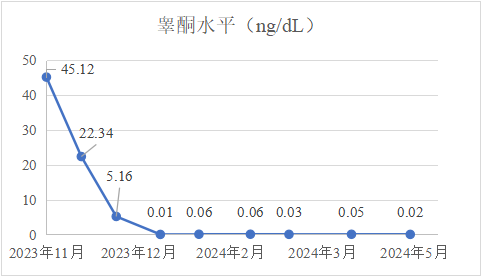 本例患者处于局部进展期阶段,需要重视治疗方案的选择。而药物去势治疗后的PSA水平影响患者预后,定期复查PSA也有助于及时明确患者病情,进而调整治疗策略。为改善患者疾病控制情况并增加近期密切随访程度,选择戈舍瑞林微球进行每4周1次治疗(相关专家共识也建议,患者在药物去势治疗初期6个月内每个月检测1次睾酮水平[1])。患者治疗后迅速达到深度降酮的去势水平(治疗1个月后,睾酮5.16 ng/dL)和PSA检测下限水平(治疗3个月后,PSA 0.037 ng/mL)。