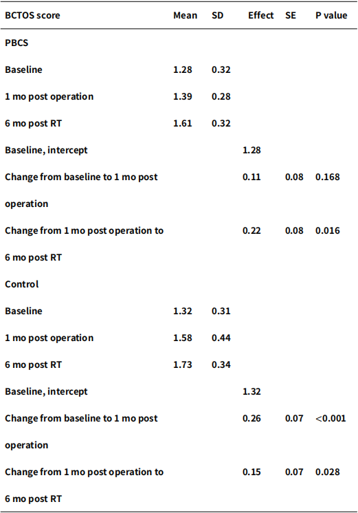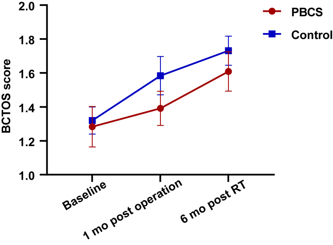 研究结果表明,在实验组中,基线评估与术后1个月的美容效果未出现显著变化(P=0.168),但术后1个月至放疗后6个月期间,美容效果出现了显著的不良变化(P=0.016)。在对照组中,基线评估与术后1个月之间美容效果发生了显著的不良变化(P<0.001),且术后1个月至放疗后6个月期间,美容效果进一步恶化(P=0.028)。两组在基线、术后1个月及放疗后6个月的BCTOS得分比较中,未发现显著差异。
