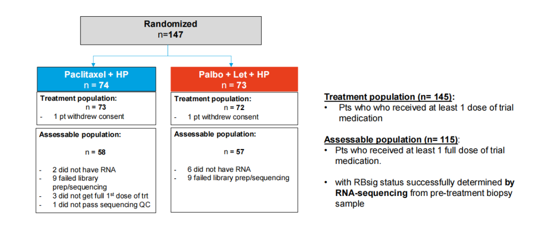 主要研究目标是评估E2F通路活性(RBsig)基因特征与病理完全缓解率(pCR,定义为ypT0/ypTis ypN0)之间的交互作用,假设RBsig高的肿瘤在T+HP组具有更高的pCR率,而RBsig低的肿瘤在Pal+L+HP组中具有更高的pCR率。RNA测序通过NEBNext®UltraTM II方向性RNA文库制备试剂盒完成,并使用Twist Human Core Exome+Custom IntegraGen富集系统进行捕获,100对端读取。RBsig评分通过标准化所有基因表达值后求和计算,并按中位数将评分分为高低两组。通过逻辑回归模型评估治疗与RBsig的交互作用。