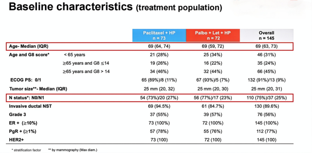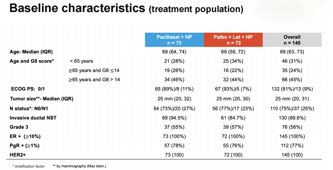 患者的中位年龄为69岁(四分位距IQR 63-73岁),其中99名患者(68%)年龄≥65岁(65人G8评分>14,34人G8≤14);91%的患者ECOG评分为0;75%的患者(109人)为cN0,肿瘤中位大小为30 mm(IQR 20-40 mm);56%的患者(76人)肿瘤分级为G3。完成治疗的比例在Pal组中较高(94.4%vs 79.5%),超过95%的患者完成了5个周期的HP治疗。98.6%的患者接受了手术,B组的保乳手术比例更高(82%vs 67%)。