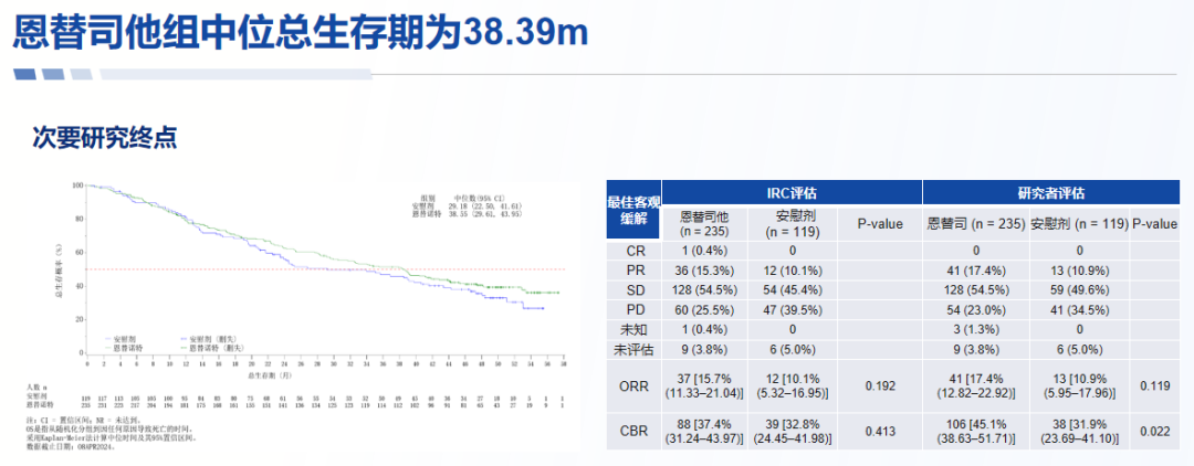 安全性方面,恩替司他组总体不良反应发生率与安慰剂组相当,且大多数不良反应为轻至中度。导致停药的主要原因包括中性粒细胞减少症、γ-谷氨酰转移酶升高和贫血等,但总体安全性可控。