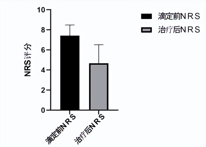 100例患者治疗前平均NSR评分为7.4分(7-10分),平均滴定成功的时间为49.6分钟(35.6分钟-56.9分钟),其中40.7%的患者30分钟内滴定成功。滴定阶段完成后的平均NRS评分为3.2分(0-6分),滴定前后NRS评分具有统计学差异(P>0.05)(图1)。