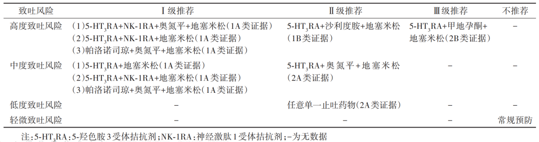 同时,该共识将5-HT3RA+NK-1RA+奥氮平+地塞米松(1A类证据)、5-HT3RA+NK-1RA+地塞米松(1A类证据)、帕洛诺司琼+奥氮平+地塞米松(1A类证据)作为高度致吐风险药物的I级推荐;将5-HT3RA+地塞米松(1A类证据)、5-HT3RA+NK-1RA+地塞米松(1A类证据)、帕洛诺司琼+奥氮平+地塞米松(1A类证据)作为中度致吐风险的I级推荐预防用药。