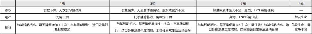 恶心、呕吐、腹泻等消化道不良事件的分级及其处理、结局如下表[3]所示。