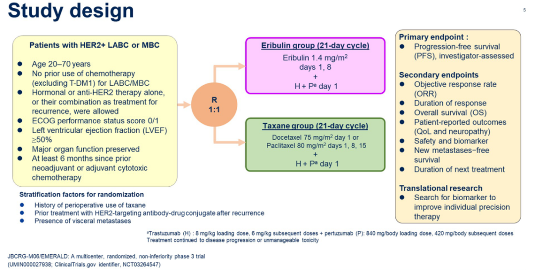 2、EMERALD研究:2024 ASCO大会报道的EMERALD研究[3],首次将艾立布林(联合曲帕双靶治疗)应用于HER2阳性晚期乳腺癌的一线治疗