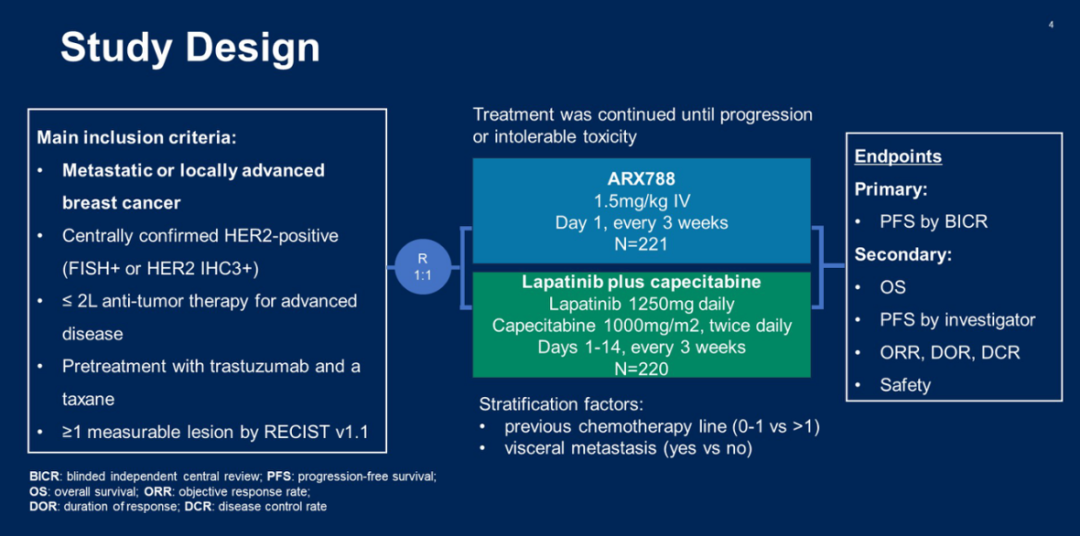 ACE-Breast-02在中国85个中心进行,入组的患者为先前接受过曲妥珠单抗和紫杉醇治疗的不可切除的HER2+(FISH+或IHC3+)晚期乳腺癌患者。先前接受过曲妥珠单抗和紫杉烷治疗的不可切除或转移性乳腺癌患者被按1:1的比例随机分配,接受ARX788或拉帕替尼联合卡培他滨治疗,根据先前的化疗线数(0~1与>1)和内脏转移(有与无)进行分层。ARX788治疗前未采取任何预防性措施。主要终点是由BIRC评估的PFS。