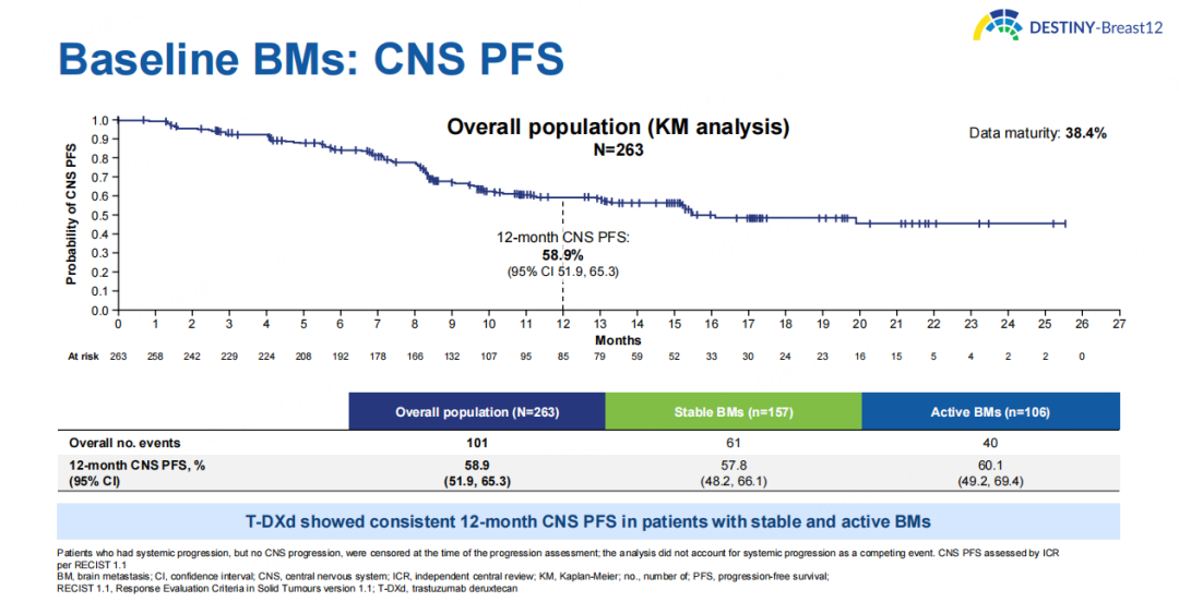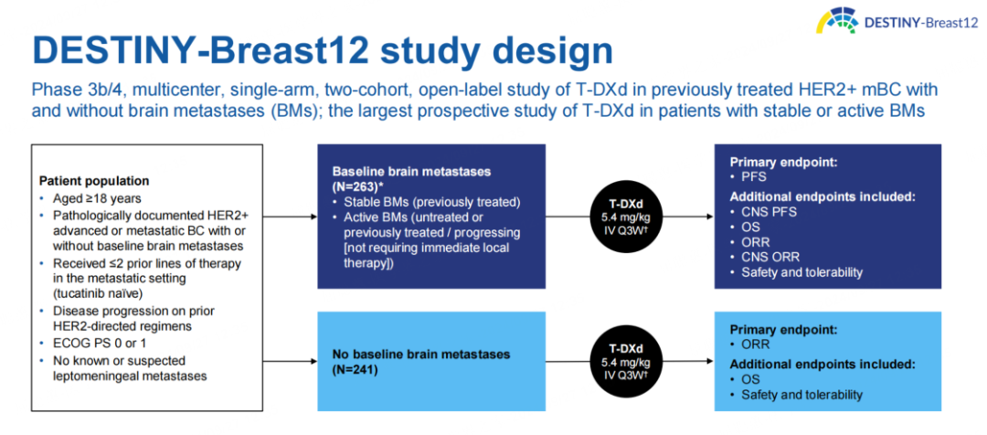 DB-12研究纳入了接受过≤2线治疗后病情进展的HER2阳性晚期乳腺癌成人患者,要求入组患者既往不能应用过图卡替尼,且无脑膜转移,分为BM组(263名;包括稳定或活动性脑转移)或非BM组(241名)。研究设计不允许跨队列比较。主要研究终点是根据RECIST 1.1标准独立中央审查的基线伴BM组的PFS或基线不伴BM组的ORR。次要终点包括CNS PFS、CNS ORR和ORR(基线伴BM组)以及安全性。
