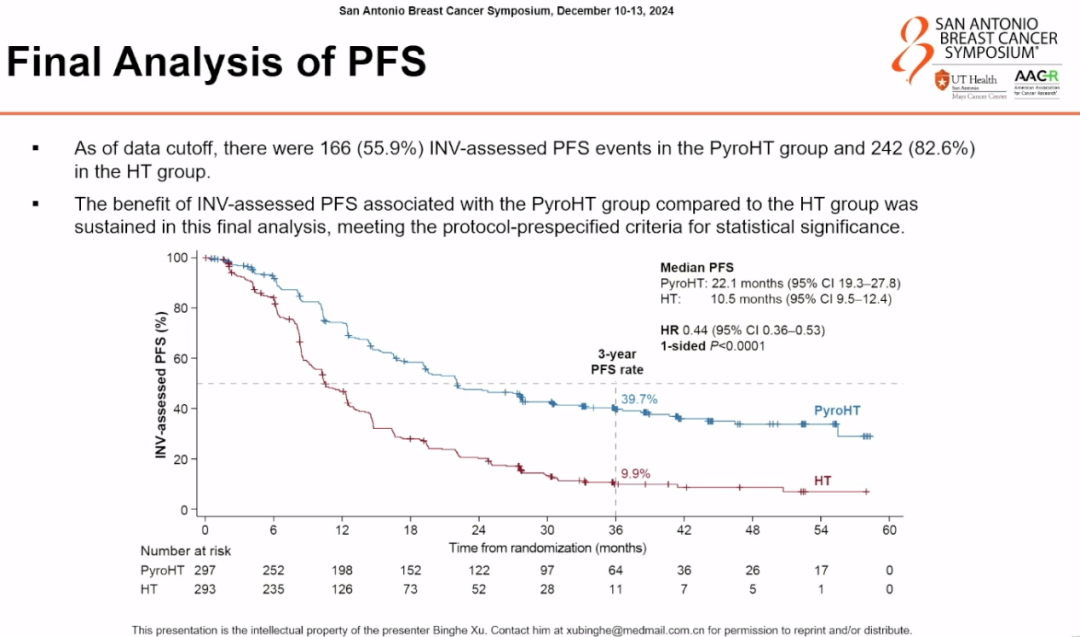 此次数据截止时间为2024年4月30日,结果显示,PyroHT组与HT组的中位随访时间分别为35.7个月和34.3个月。PyroHT组和HT组研究者评估的中位PFS分别为22.1个月vs.10.5个月(HR=0.44;95%CI:0.36~0.53;P<0.0001)。尽管OS数据尚未成熟,但显示了积极的获益,死亡风险降低36%(HR 0.64,单侧P=0.0038),吡咯替尼组有74.5%的患者可达到4年生存,而对照组为64.3%。