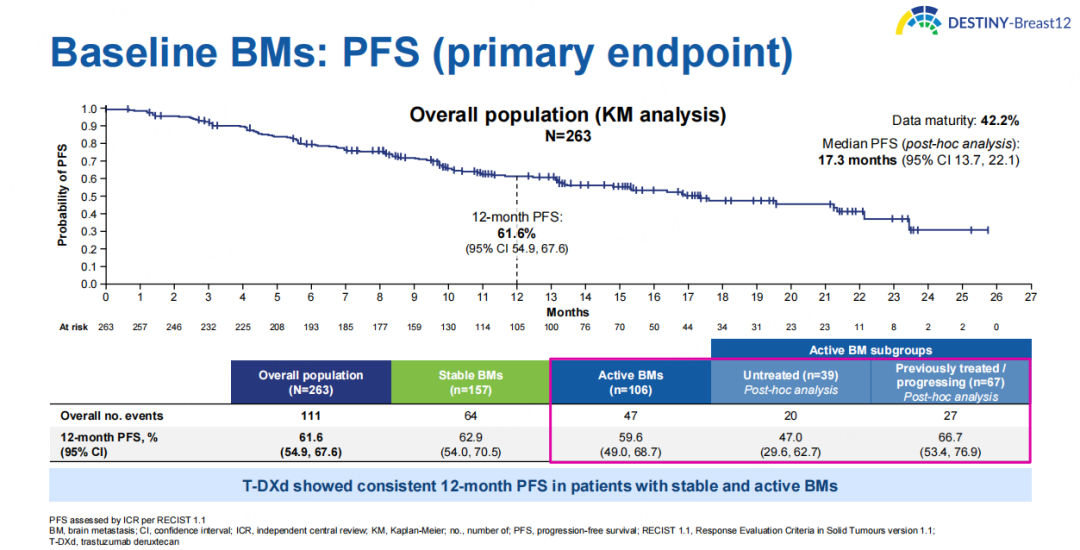 研究共纳入504例患者,截至2024年2月8日,BM组的中位随访时间为15.4个月,非BM组的中位随访时间为16.1个月。基线存在BM队列的中位PFS为17.3个月(数据成熟度:42.2%),12个月PFS率为61.6%,稳定性和活动性BM患者的12个月PFS率分别为62.9%和59.6%。