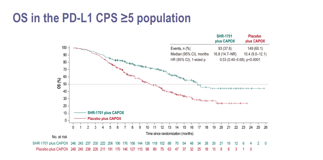 前期公布的研究结果显示,在PD-L1 CPS≥5和意向治疗人群(ITT)中,SHR-1701+CAPOX方案均较CAPOX方案取得了无进展生存期(PFS)和总生存期(OS)的明确获益: