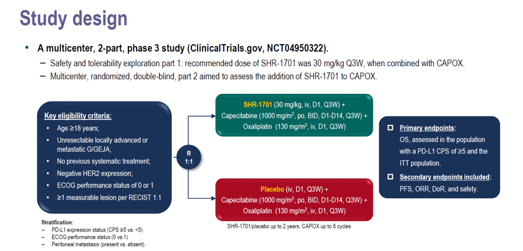 彭智教授:谢谢沈教授的介绍。2024 ESMO年会我们已经报告了此项研究的主要结果。该研究是一项全国多中心、2阶段、3期临床研究,我们在第1阶段探索并确认了SHR-1701推荐剂量为30mg/kg Q3W,并验证了其联合CAPOX(奥沙利铂+卡培他滨)的安全性和耐受性。第2阶段为全国、多中心、随机、双盲对照研究,主要针对HER2阴性晚期胃癌,在一线治疗中探索SHR-1701联合或不联合CAPOX方案的疗效和安全性。