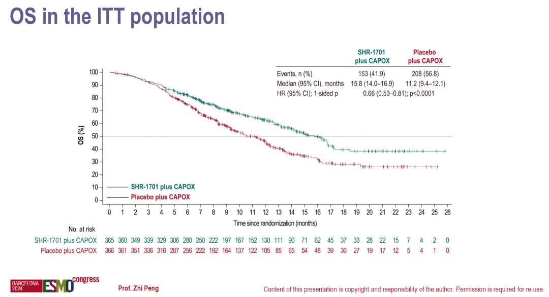 ITT人群中mOS:15.8个月vs 11.2个月,HR=0.66(95%Cl:0.53-0.81),P<0.0001