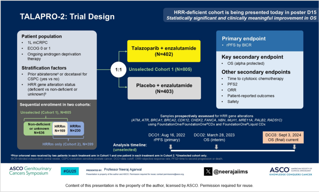Agarwal教授:首先,我想聚焦于全人群谈谈TALAPRO-2研究,该研究是一项全球多中心、双盲的III期临床试验,共招募了805例患者,且无论患者是否有HRR基因突变。主要终点是影像学无进展生存期(rPFS),关键次要终点是受α保护的总生存期(OS)。