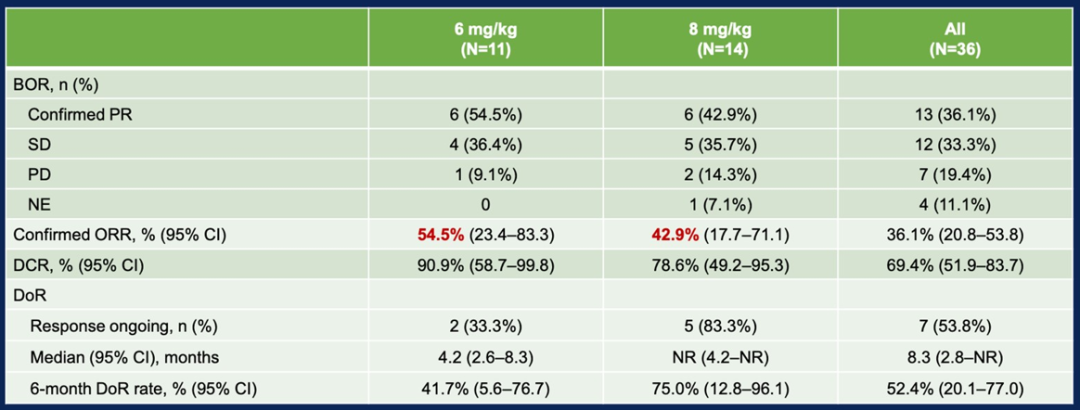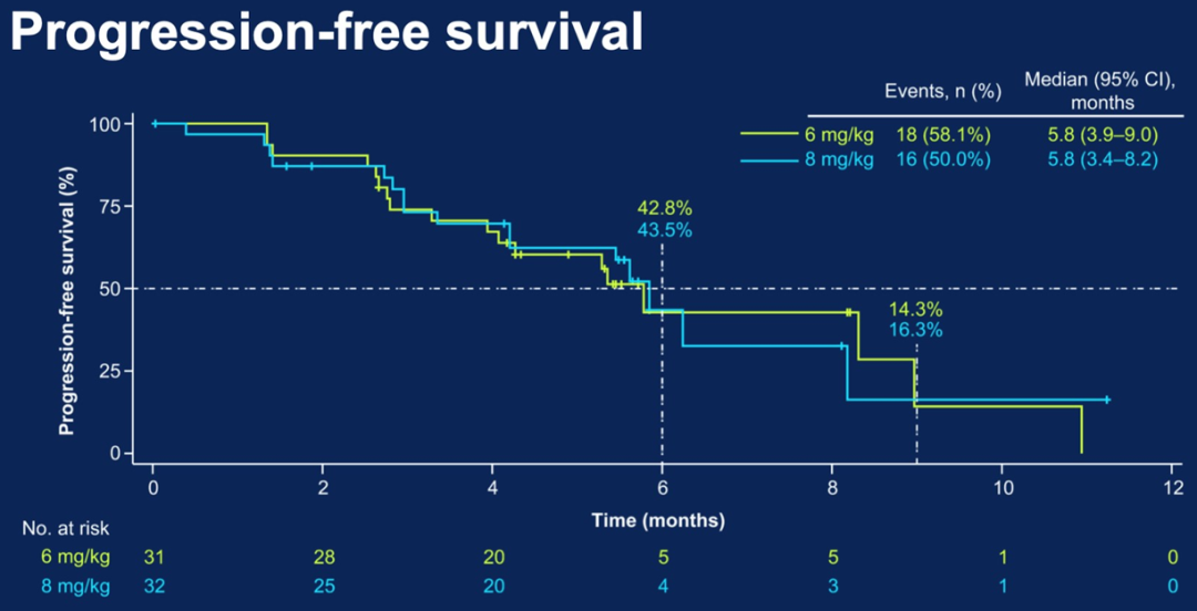 唐碧霞教授:本研究纳入了既往治疗失败的患者(其中大部分为多线治疗失败),共入组81例。疗效结果显示,在有效剂量组中,6mg和8mg剂量组的客观缓解率(ORR)分别为41.9%和50.0%,疗效持续时间分别为7.6个月和5.5个月,无进展生存期(PFS)均为5.8个月。目前,总生存期(OS)数据尚不成熟。已有的这些数据表明,该药物具有进一步探索的潜力。