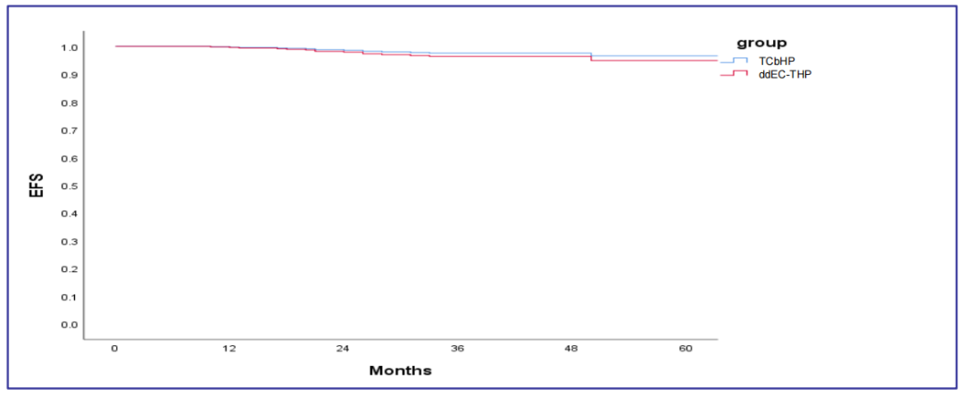 研究共纳入499例患者,其中60%接受含蒽环类药物的EC-T方案,40%接受去蒽环类药物的TCb方案。结果显示,两组的pCR率相近,无显著统计学差异:EC-T组pCR率为60.7%,TCb组为63.7%(P=0.519)。在三年无事件生存(EFS)率方面,两组亦无显著差异(HR 0.665,95%CI:0.186-2.382,P=0.53),含蒽环组为98.6%,TCb组为98.4%。