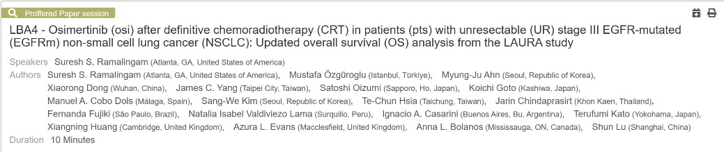 同步放化疗后未进展的不可切除III期EGFR突变非小细胞肺癌患者接受奥希替尼维持治疗的疗效及安全性:III期LAURA研究的OS数据更新
