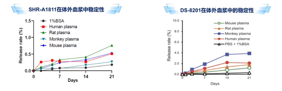 图9.瑞康曲妥珠单抗与DS-8201体外血浆稳定性分析