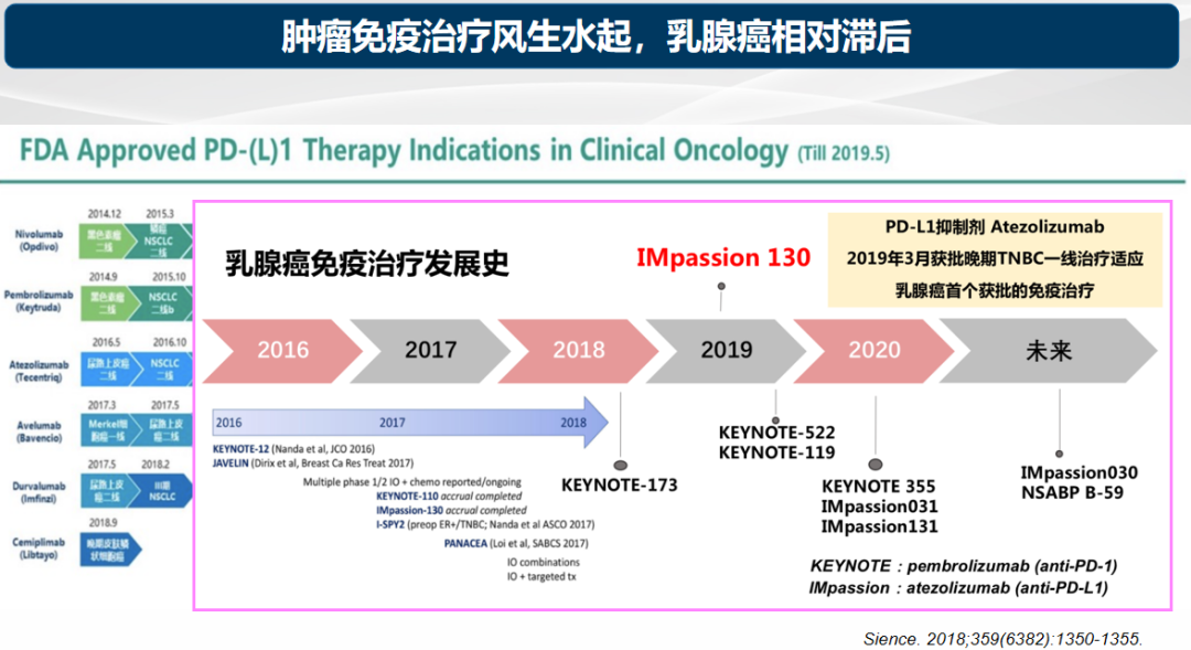直到2019年,基于IMpassion 130研究,PD-L1抑制剂Atezolizumab(阿替利珠单抗)才获批用于晚期三阴性乳腺癌(TNBC)的一线治疗,成为乳腺癌领域首个获批的免疫检查点药物,这一里程碑事件开启了乳腺癌免疫治疗的新纪元。此后,一系列重要研究相继展开,KEYNOTE-522研究发现,在新辅助阶段加入PD-1抑制剂帕博利珠单抗,显著提高患者的病理完全缓解率(pCR)和无病生存期(EFS)。这一突破推动了免疫治疗从晚期向早期乳腺癌前移,成为TNBC新辅助治疗标准[2-4]