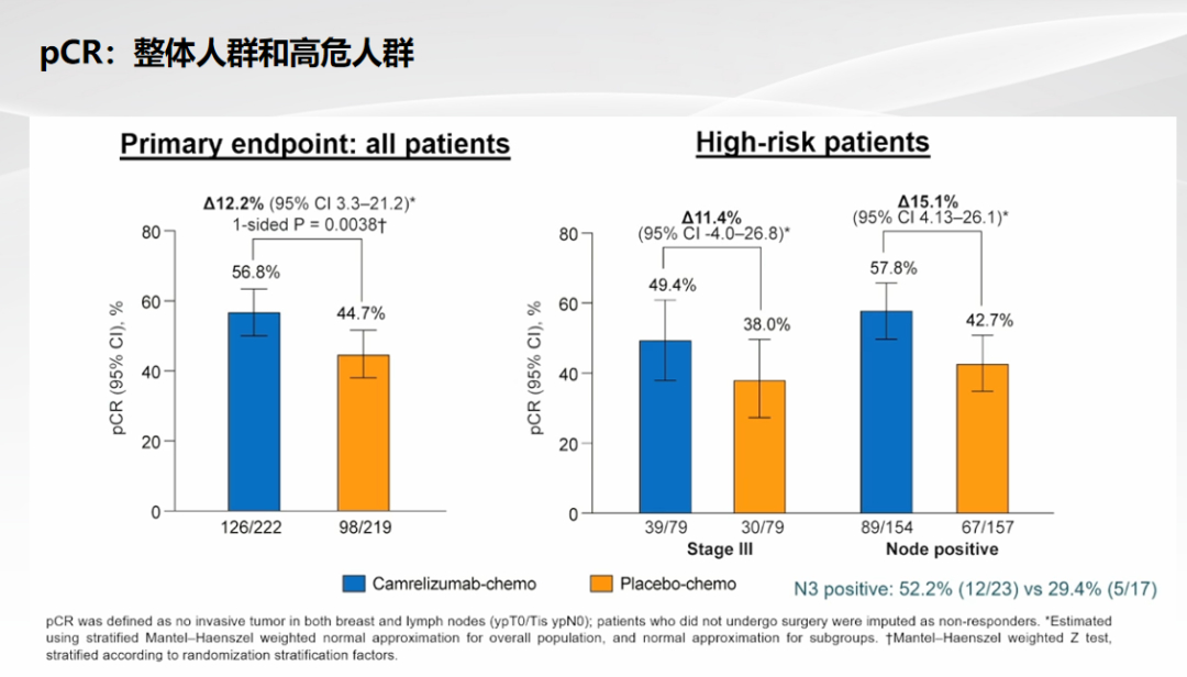 CamRelief研究(NCT04613674)聚焦于中国三阴性乳腺癌患者群体。该研究证实,卡瑞利珠单抗联合化疗用于新辅助治疗,能够显著提高患者的pCR率。中位随访14.4个月,在标准化疗方案上加用卡瑞利珠单抗的患者,其病理学完全缓解率为56.8%,显著优于对照组的44.7%,绝对获益高达12.1%。研究为中国乳腺癌免疫治疗的临床实践提供了有力的支持[14]