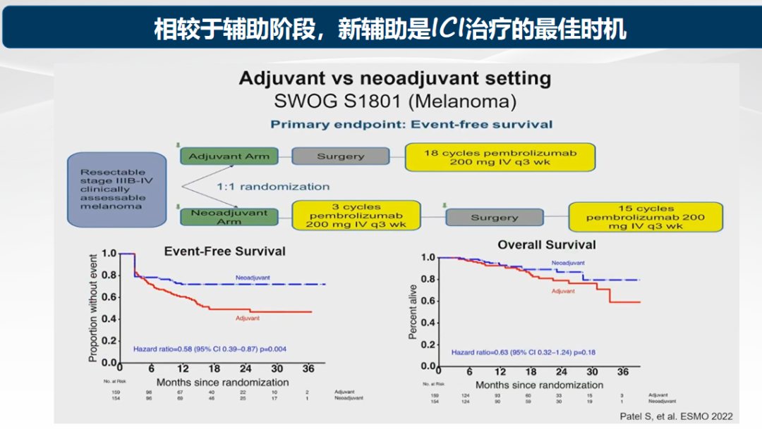 通过对比新辅助阶段和辅助阶段的免疫治疗效果发现,在黑色素瘤(SWOG S1801研究)和乳腺癌(KEYNOTE-522)等研究中,新辅助免疫治疗均展现出更优的生存获益。这使得新辅助阶段成为免疫检查点抑制剂(ICI)治疗的“黄金窗口”[8-10]