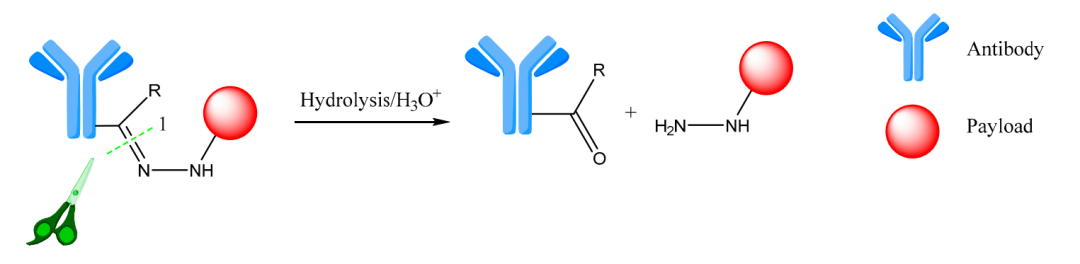 pH敏感连接子利用肿瘤组织(pH 6.5-7.0)和内涵体/溶酶体(pH 4.8-5.5)的酸性环境与血液(pH 7.4)之间的pH梯度实现选择性药物释放。这类连接子通常含有酰肼键(hydrazone),在酸性条件下发生水解(图1)。典型的例子是BR96-阿霉素(BR96-Dox),该ADC通过6-马来酰亚胺基己酰基酰肼连接子将阿霉素与抗Lewis Y抗体BR96相连。