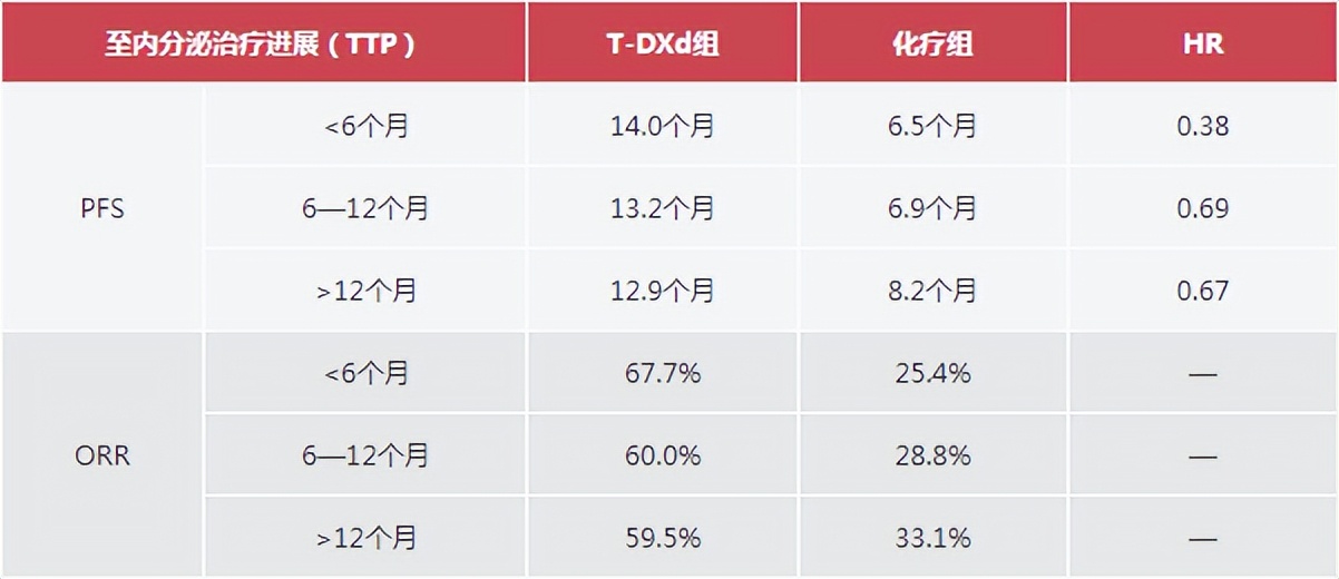 DB-06研究显示有无肝转移、原发或继发ET耐药、是否接受过(新)辅助化疗等不同亚组的患者均有PFS,尽管尚未知不同亚组患者的ORR差异,但2024年SABCS大会报道一项针对DB-06研究的事后分析[8]显示,在不同内分泌治疗进展时间(TTP)的患者中,均表现出一致的T-DXd治疗获益,尤其在TTP短(<6个月)的、此类被认为侵袭性较高的肿瘤中,T-DXd的ORR仍高达67.7%,是化疗组25.4%的2倍多,表明T-DXd也能够快速、强效地控制肿瘤。