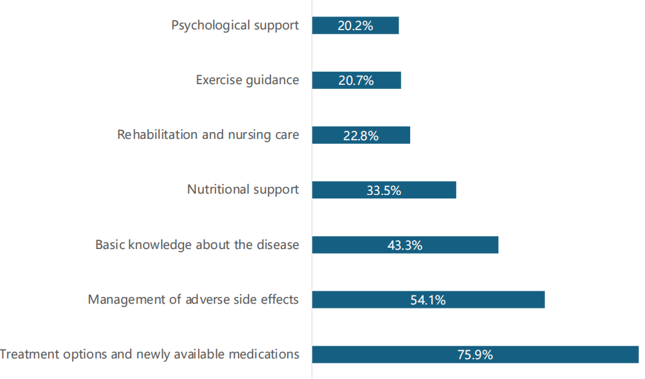 患者使用不同的信息来源以增加知识和交流建议,包括患者支持小组(58.9%)、社交媒体渠道(51.5%)以及与医疗专业人员的沟通(50.7%)。患者最关心的疾病相关话题包括新型治疗方案和新药开发(75.9%)、不良反应管理(54.1%)以及基本疾病知识(43.3%)(图4)。