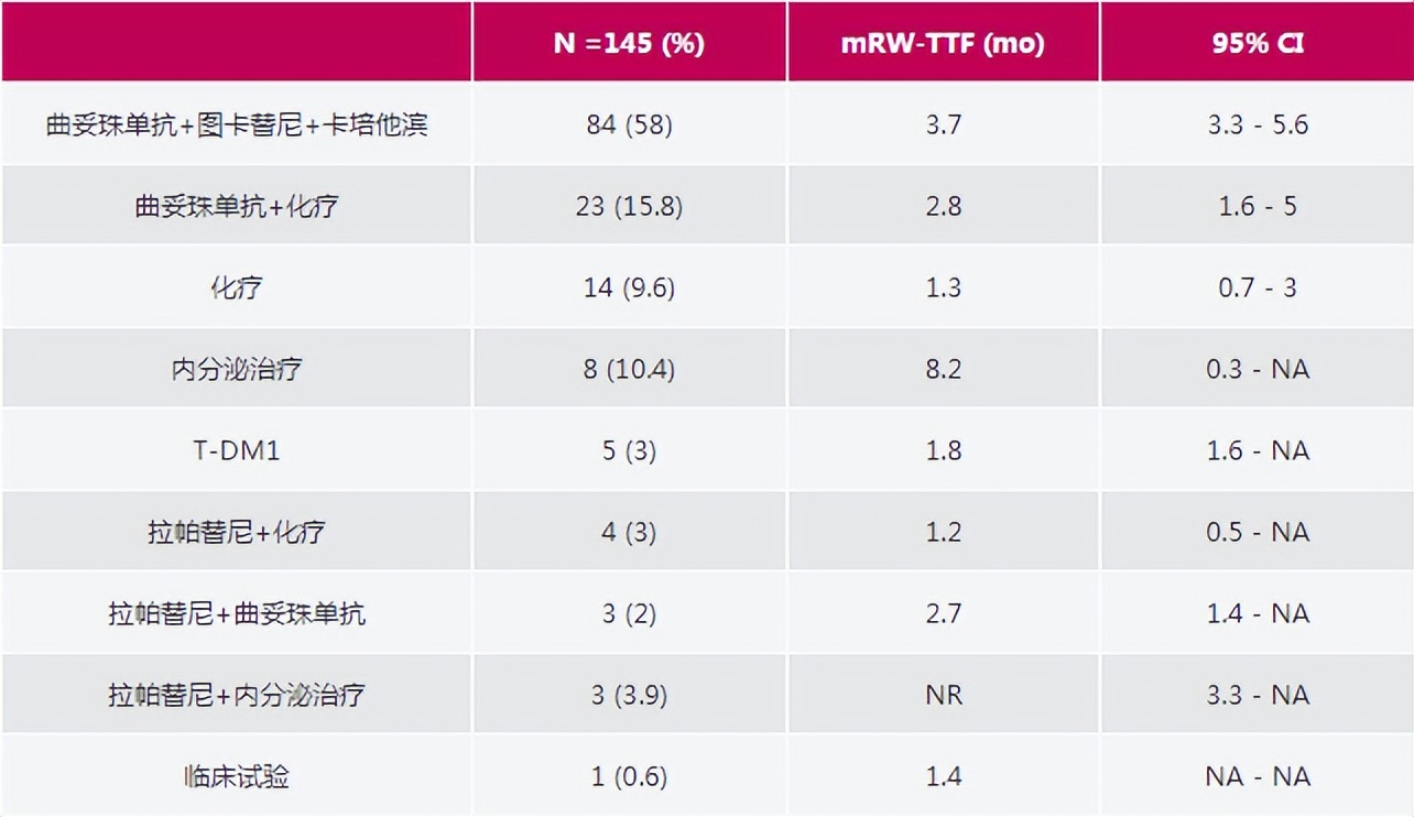 最常使用的一线治疗方案是曲妥珠单抗+图卡替尼+卡培他滨(58%)和曲妥珠单抗联合化疗(15.8%),中位至治疗失败时间(TTF)分别为3.7个月和2.8个月;