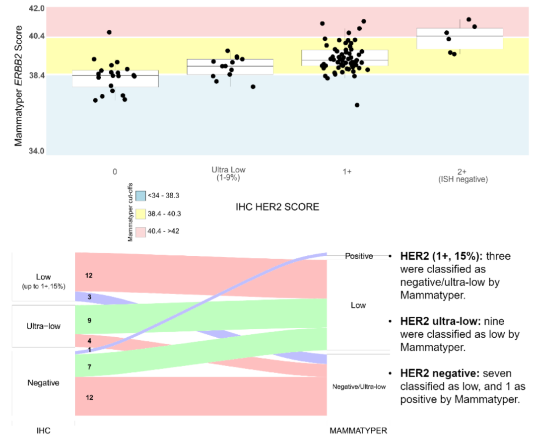此次ASCO大会报道了一项意大利的研究[5],对比了qRT-PCR(MammaTyper)和IHC检测乳腺癌HER2、HR、Ki-67等关键标志物的效能。该研究共纳入了101例HR阳性乳腺癌样本(包括:HER2 0表20例,超低表达13例,低表达68例),从用于IHC分析的相同FFPE肿瘤块中提取RNA进行qRT-PCR检测。研究结果显示: