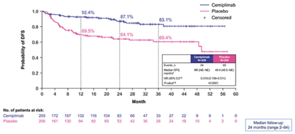 在中位随访24个月后,该试验达到了其主要终点,证明与安慰剂相比,cemiplimab在DFS方面有显著改善(HR 0.32,95%CI:0.20~0.51;P<0.0001)。西米普利单抗组的估计2年DFS率为87%,安慰剂组为64%。在评估的亚组中,观察到cemiplimab在DFS方面的改善。