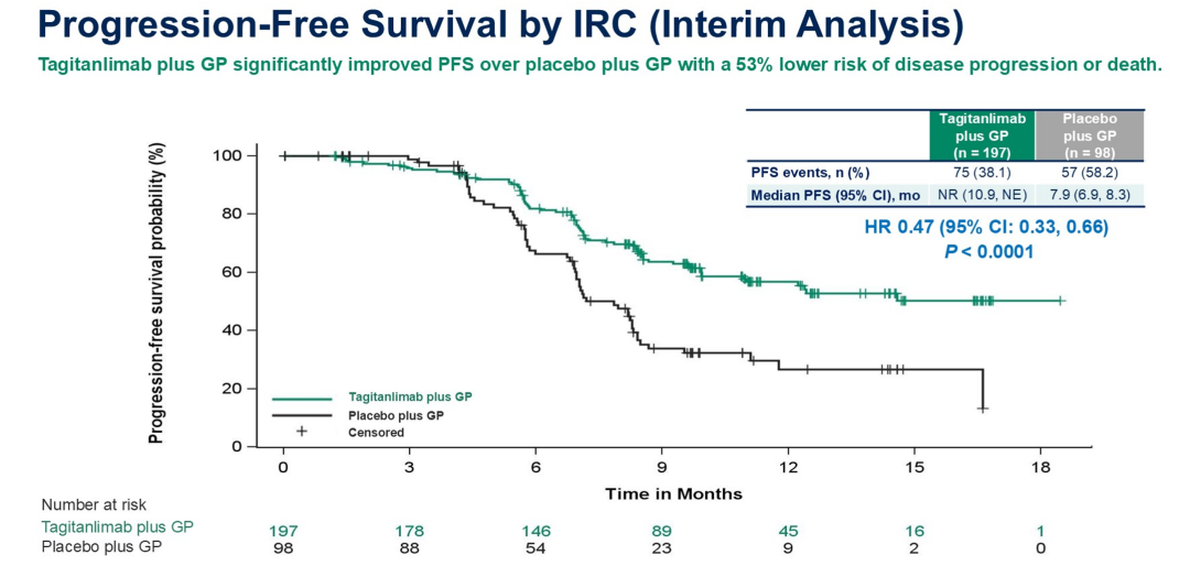 在肿瘤缓解方面,与单独化疗组相比,塔戈利单抗联合化疗组具有更高的ORR(81.7%vs 74.5%);中位持续治疗缓解时间(DoR)延长近1倍(11.7 vs 5.8个月;HR 0.48,95%CI:0.32-0.70)。OS数据尚未成熟,但已显示出塔戈利单抗联合化疗组的获益趋势,目前死亡风险降低38%(HR 0.62,95%CI:0.32-1.22);此外,安全性与既往报道一致,患者的治疗耐受性良好。