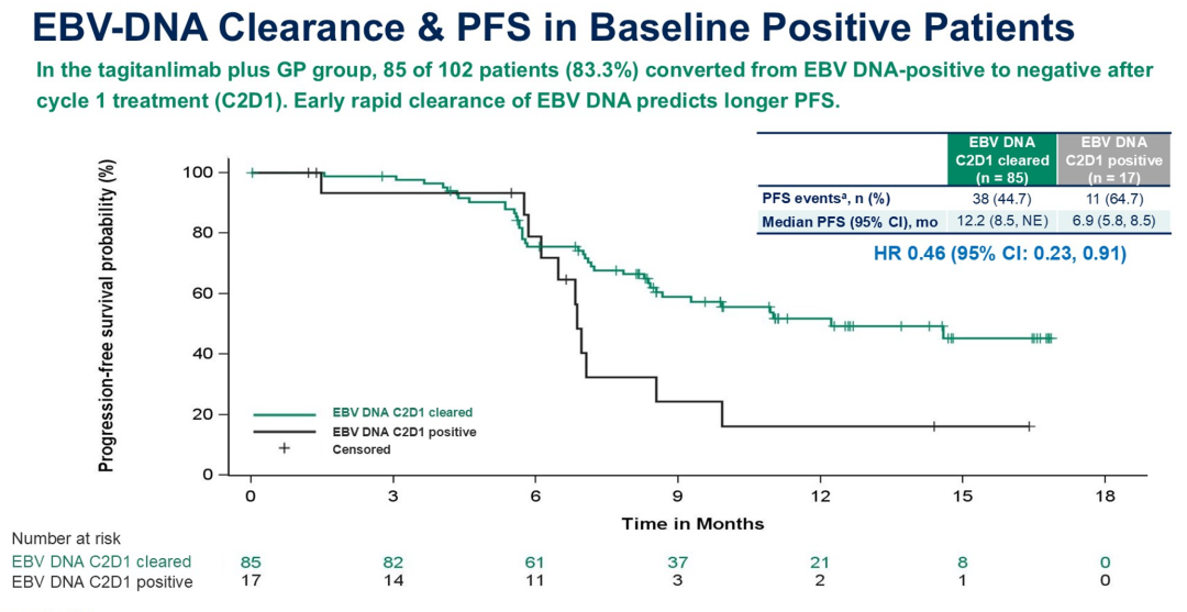 塔戈利单抗在NPC领域还有不少探索方向。以往的PD-1抑制剂相关研究中,PD-L1高表达被认为是ICIs免疫治疗敏感的生物标志物,但在既往研究中,PD-L1抑制剂塔戈利单抗联合化疗在不同PD-L1表达水平患者中均有PFS获益,其背后机制值得进一步探讨。此次报告的研究显示,EBV-DNA清除能够预测PFS,第1周期治疗后EBV DNA从阳性转为阴性的患者,相较于EBV DNA阳性患者具有更好的PFS(12.2 vs 6.9个月,HR 0.46)。再者,TIL,TMB、dMMR/MSI-H等其他生物标志物在塔戈利单抗中是否也具有临床应用价值,期待有更多探索性分析或转化研究。