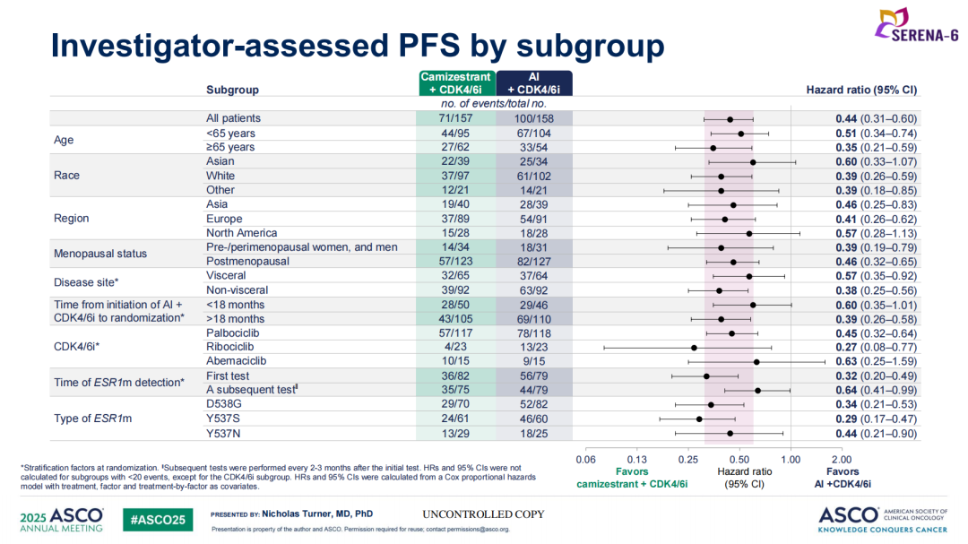 对此,我们有两个非常期待的答案:第一,我们能否找到更好的方法来检测ctDNA,以提高其阳性率和准确率,从而更精准地检测ESR1突变率?第二,我们也期待新型口服SERD药物Camizestrant能否在更广泛的人群中(甚至不需要检测ctDNA的情况下),在更前线的治疗中取得阳性结果。我们也期待未来中国参与的III期SERENA-4研究能为我们揭晓答案。