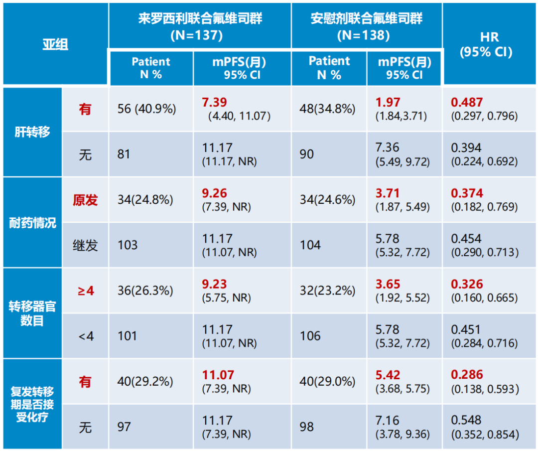 预先设定的PFS亚组分析显示,不同亚组患者治疗结果与整体研究结果一致。尤其是肝转移(HR 0.487)、原发耐药(HR 0.374)、高肿瘤负荷(转移器官数目≥4)(HR 0.326)、接受过化疗(HR 0.286)等难治人群,大幅度提高了PFS,显著降低了疾病进展及死亡风险。期待随着随访时间延长,OS数据能够给我们带来更多惊喜。