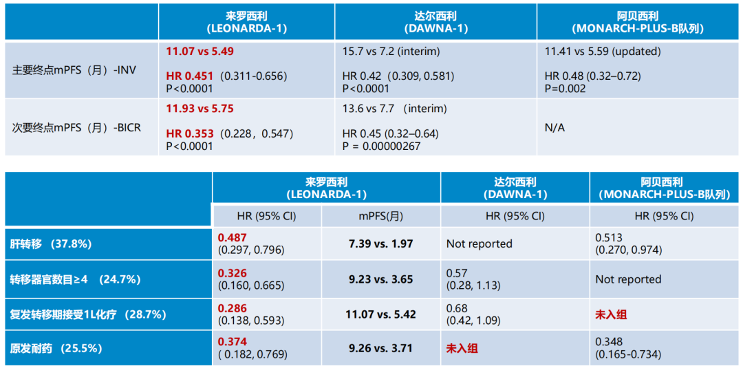 除了入组患者更加宽泛,LEONARDA-1研究显示来罗西利对肝转移、转移器官数目≥4、复发转移期接受1L化疗、原发耐药等难治性患者,也有非常好的PFS获益,而这些数据在其他完全针对中国患者的同类CDK4/6i相关临床研究中并未完全获知[5-7]