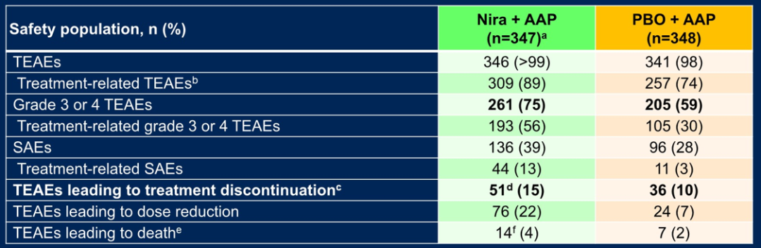 696名患者随机分配接受尼拉帕利+AAP治疗(n=348)或安慰剂治疗(n=348)。中位年龄为68岁;55.6%的患者存在BRCA1/2变异,78%为高容量转移(M1),87%为新发M1,16%的患者既往使用多西他赛治疗。
