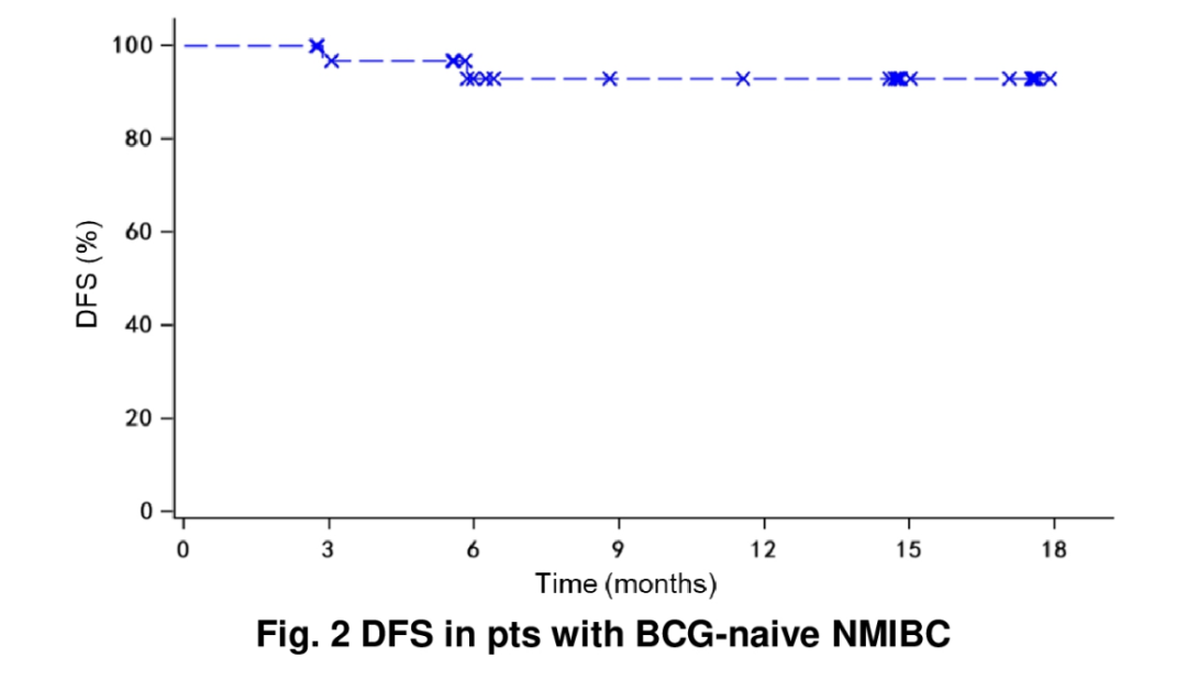 SHR-1501则是一种IL-15激动剂融合蛋白,可增强NK细胞和CD8+T细胞活性。我们的1/2期研究显示也显示了SHR-1501±BCG有积极的初步疗效,队列B(BCG无应答的CIS患者)的3或6个月CR率达90.9%,队列A(BCG初治患者)和队列C(BCG无应答的乳头状瘤患者)的9个月DFS率分别为94.4%和53.9%;无剂量限制性毒性(DLT),也没有达到最大耐受剂量(MTD)。