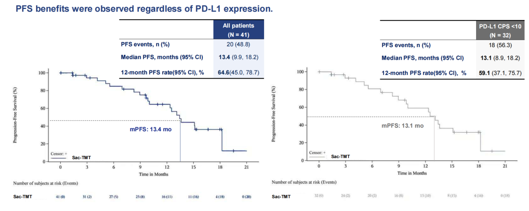 PD-L1阴性(CPS<10)的乳腺癌患者并非免疫治疗敏感人群,这类人群的治疗选择十分有限。OptiTROP-Breast05研究中有78%的入组患者为CPS<10,也显示了与总体人群一致的获益,ORR为71.9%,中位PFS为13.1个月