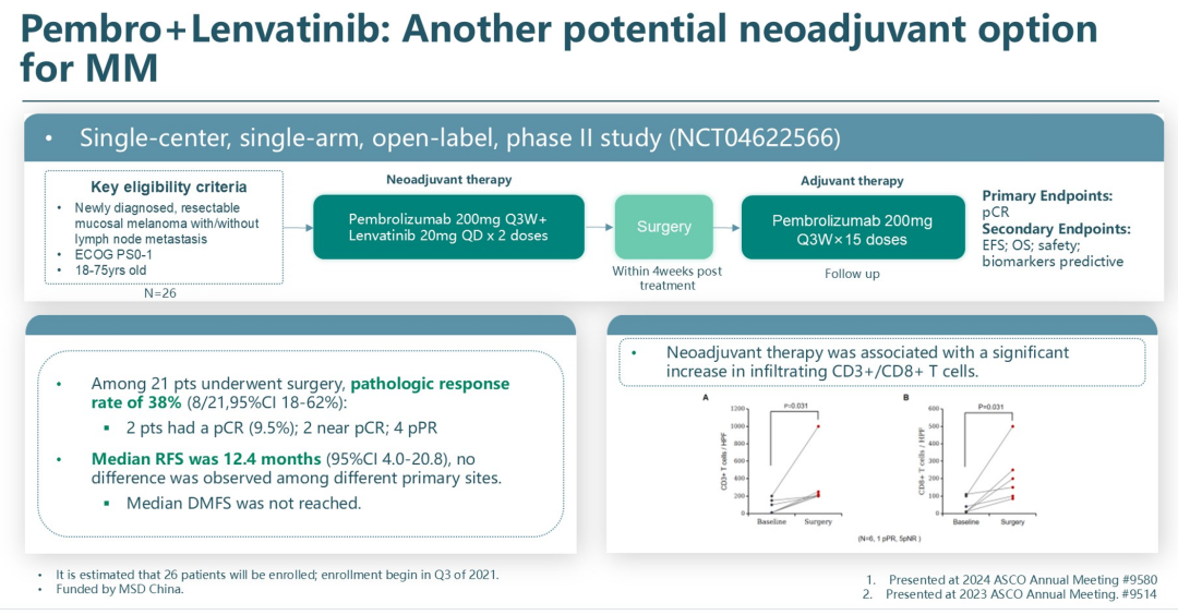 MM在西方人群中较为罕见,但在中国及亚洲患者中有一定的比例,仍存在不小的临床治疗需求。在围手术期治疗方面,尽管免疫治疗在黑色素瘤治疗中取得了巨大成功,但化疗仍然是MM辅助治疗的基石。目前正在探索将抗PD-1联合VEGF-TKI用于MM新辅助治疗。对于晚期MM的治疗,单独使用抗PD-1单药治疗或抗PD-1联合抗CTLA4/LAG3/CTLA4+LAG3显示疗效有限。然而,抗VEGF联合免疫治疗MM则具有较好的治疗活性,期待未来有进一步的扩大样本的前瞻性研究加以验证,并且有其他新型机制的药物用于此类患者的治疗研究中。