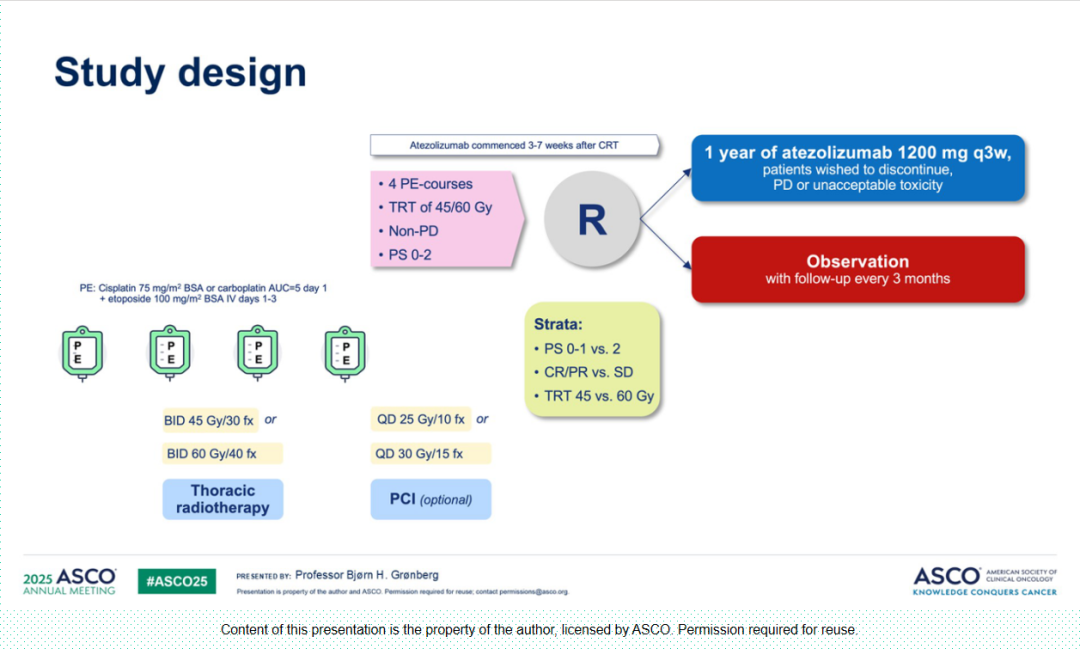 Prof.Bjørn Henning Grønberg:This was a European trial.We enrolled 260 patients at 37 hospitals in six countries of Europe.Patients who completed platinum/etoposide chemotherapy and twice daily thoracic radiotherapy(TRT)of 45 to 60 grade were randomized 1:1 to receive either 1 year atezolizumab or observation.We saw that the median treatment period in the atezolizumab was eight infusions.There were some more adverse events in the experimental arm,but we didn’t see any new safety signals,and 35%of the patients completed 1 year of treatment.