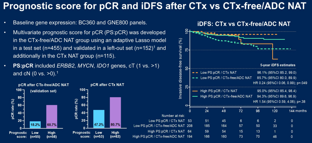 当然,需注意该研究中,大部分(~95%)患者为I期和II期,近70%的患者腋窝淋巴结阴性。在“降阶梯”治疗中,除了考虑肿瘤负荷和淋巴结状态,还需考虑肿瘤的生物学行为。随着精准医学的不断发展,我们需要更精准的手段来识别哪些患者能从“降阶梯”治疗中获益。WSG的汇总分析中,使用了一种基于基因和临床病理特征(ERBBB2、MYCN、IDO1基因,cT和cN)的prognostic Score(PS)预测pCR,结果显示PS评分高相较于PS评分低的患者,接受“去化疗”新辅助治疗有更高的pCR率(18.2%vs 60.7%),但PS评分低且达到pCR的患者中联合化疗新辅助的患者iDFS更好。