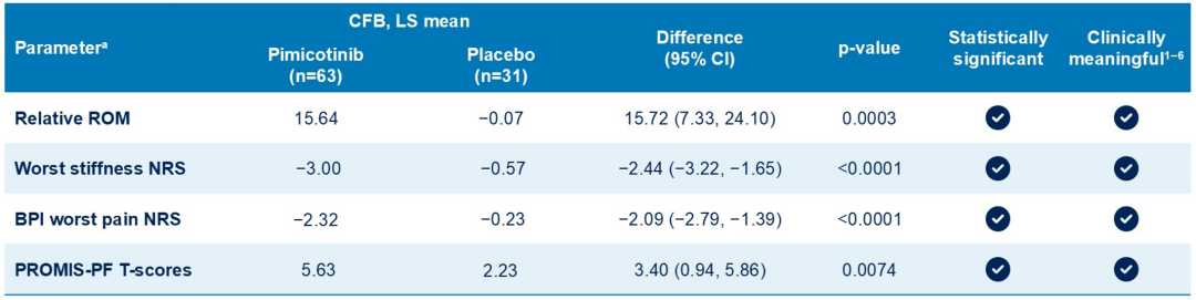 此外,研究还评估了活动范围(ROM)、最严重的僵硬、最严重的疼痛(根据BPI评分)、躯体功能(根据PROMIS评分)等患者报告结局,结果显示具有不同程度的改善。