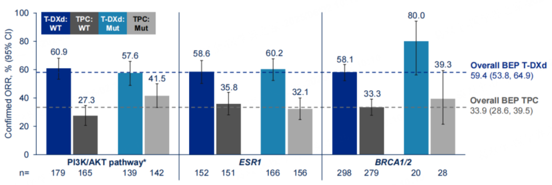 2025年ASCO大会报道了DB-06研究的生物标志物探索性分析[11]结果显示,在携带PI3K/AKT通路变异(57.6%vs 41.5%)、ESR1突变(60.2%vs 32.1%)、BRCA1/2突变(80%vs 39.3%)的患者中,T-DXd组的客观缓解率(ORR)均高于TPC组。