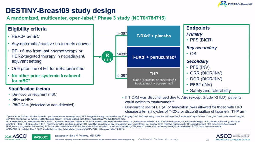 [1]Sara Tolaney,et al.Trastuzumab deruxtecan(T-DXd)+pertuzumab(P)vs taxane+trastuzumab+pertuzumab(THP)for first-line(1L)treatment of patients(pts)with human epidermal growth factor receptor 2–positive(HER2+)advanced/metastatic breast cancer(a/mBC):Interim results from DESTINY-Breast09.J Clin Oncol 43,2025(suppl 17;abstr LBA1008)