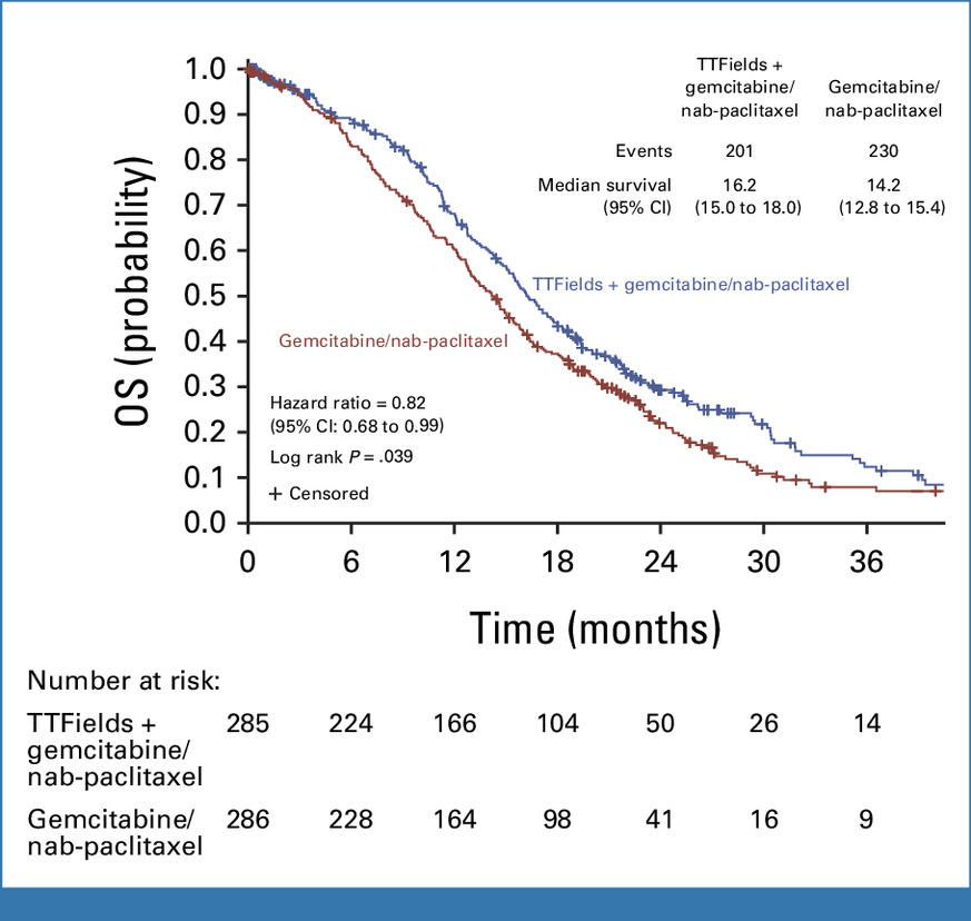 PANOVA-3研究结果显示,TTFields联合化疗方案的mOS具有显著优势,与单纯化疗相比(mOS 14.2个月),联合治疗显著延长mOS至16.2个月,风险比(HR)为0.819(95%CI 0.676-0.991),P=0.039(图5)。mOS绝对值差异达2个月,与NAPOLI-3研究[10]表现一致。
