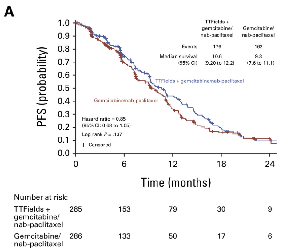 TTFields联合化疗组还具有更好的客观缓解率(ORR:36.1%vs 30.0%)。在安全性方面,TTFields联合化疗组较化疗未增加全身性毒性,因不良事件导致TTFields相关治疗中断率仅8.4%,主要为皮肤不良反应所致,整体安全可耐受。