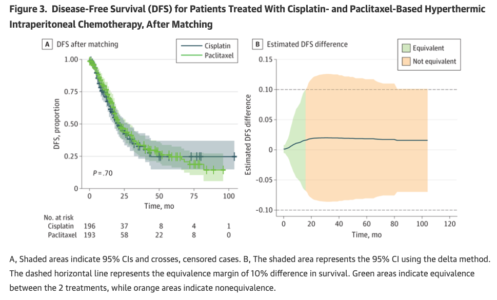 总体来看,本研究是首项通过大样本匹配分析证实紫杉醇HIPEC在生存结局、主要并发症及DFS方面与顺铂等效的研究,因此对于铂类药物不耐受或耐药、体质虚弱或肾功能进行性恶化的患者,该方案可成为有价值的替代选择。