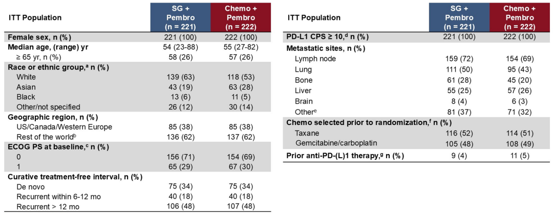 这是一项全球多中心III期临床试验,旨在探讨SG或化疗联合帕博利珠单抗用于PD-L1阳性mTNBC一线治疗的疗效和安全性。该研究的入组人群非常符合当前的临床实践,包含了初诊转移(34%)和晚期复发(66%)患者,这些复发转移患者涵盖了不同转移部位(淋巴结71%,肝25%,肺47%,骨24%,脑3%)。