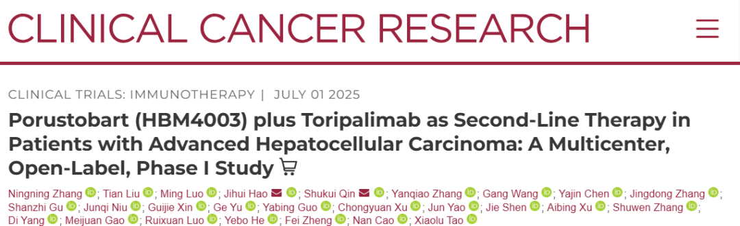 编者按:肝细胞癌(HCC)是我国发病率、死亡率较高的恶性肿瘤之一。近年来,靶向、免疫治疗的发展为晚期HCC预后带来了长足进步,但对于一线治疗失败患者,二线治疗领域尚欠缺有效的治疗方案。2025年7月,《Clinical Cancer Reserch》(IF 10.2)发表了郝继辉教授团队一项晚期HCC二线双免疫治疗的多中心、开放性I期研究,为晚期HCC二线治疗带来了潜在的双免疫治疗策略。