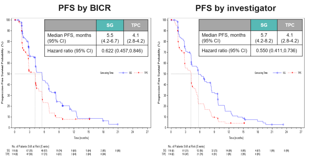 中位随访13.6个月显示,戈沙妥珠单抗较TPC改善了盲法独立中央审查(BICR)评估的mPFS,为5.5个月vs 4.1个月,HR 0.622(95%CI:0.457-0.846);研究者评估的mPFS为5.7个月vs 4.1个月,HR 0.550(95%CI:0.411-0.736);且各亚组获益一致。戈沙妥珠单抗为中国人群带来的PFS获益在绝对值方面及HR改善方面较整体人群具有优势趋势。
